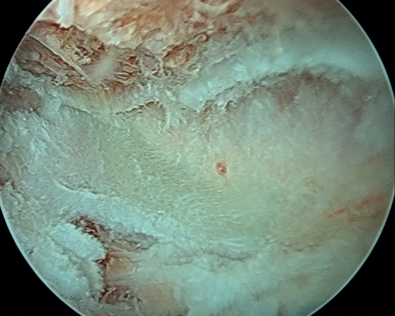 A través del portal de trabajo y con ayuda de sinoviotomo y radiofrecuencia, se procedió a la extirpación del tejido fibroso y bursal para exponer el ángulo superomedial de la escápula, localizado mediante palpación directa y la movilización indirecta de la escápula al mover el brazo (Figura 4).