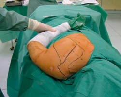 La cirugía (bursectomía y extirpación parcial del ángulo superomedial de la escápula) fue realizada por el mismo cirujano en todos los casos. La técnica se realizó bajo anestesia general, con el paciente en decúbito prono y en posición de “ala de pollo” (Figura 1).