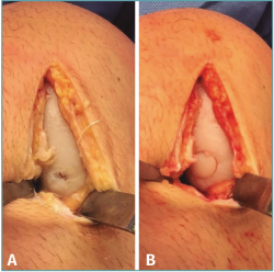 Figura 1. Trasplante osteocondral autólogo. A: lesión condral contenida en zona de carga del cóndilo femoral medial de la rodilla izquierda ICRS (International Cartilage Repair Society) IV de 10 mm de diámetro; B: tras desbridamiento de la lesión y obtención de bordes acantilados (perpendiculares al hueso subcondral), se realiza transferencia de un cilindro osteocondral obtenido de la tróclea femoral (zona dadora) hacia el defecto, logrando una fijación por presión adecuada del injerto y una superficie articular congruente.