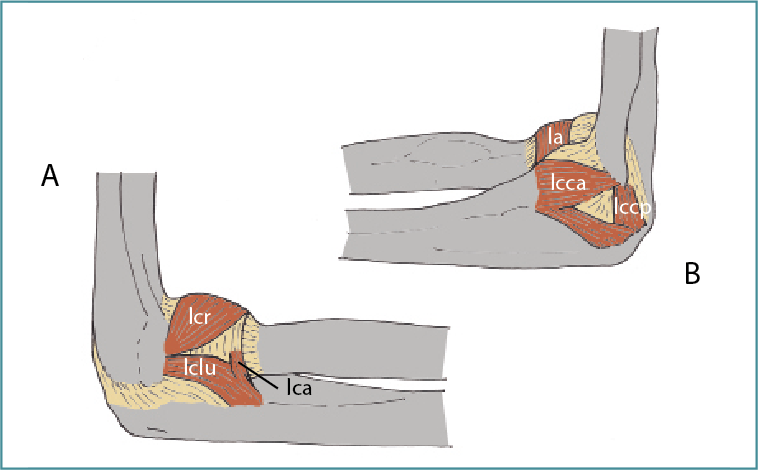 Figura 2. Anatomía ligamentosa del codo en su visión lateral y medial. Se aprecian los ligamentos colateral cubital con sus bandas anterior (lcca) y posterior (lccp), colateral radial (lcr) colateral lateral ulnar (lclu), ligamento colateral accesorio (lca) y anular (la).