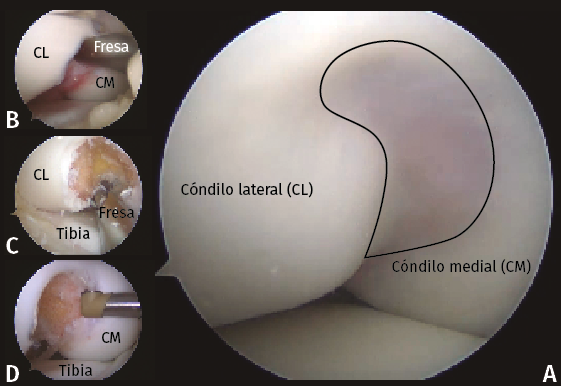 Figura 3. Imagen artroscópica de la rodilla derecha a través del portal anterolateral. A: ausencia completa de escotadura intercondílea y agenesia de ambos ligamentos cruzados; B: labrado del neointercóndilo utilizando fresa de hueso (CL, CM); C: visión de la escotadura intercondílea y la cara medial del CL, desde portal anteromedial; D: visión desde portal anterolateral. Cara lateral del cóndilo medial.