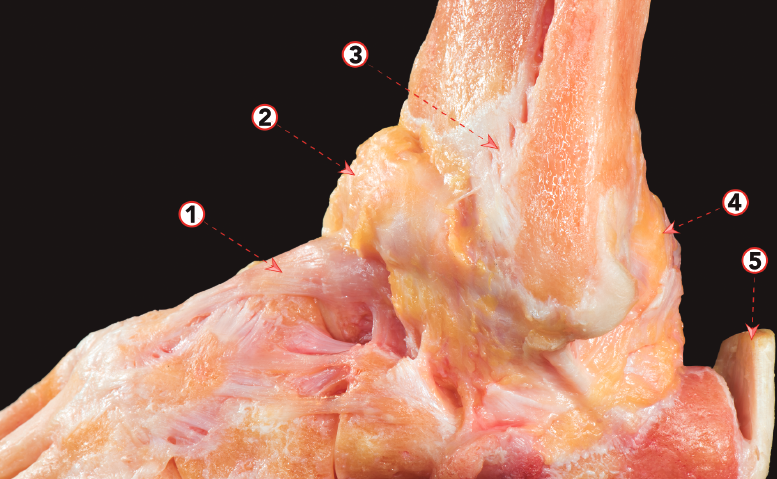 Figura 1. Visión lateral de una disección osteoarticular del tobillo, donde la cápsula anterior ha sido preservada e inyectada con aire. Esta imagen permite entender la creación de un espacio de trabajo anterior durante la artroscopia de tobillo. 1: ligamento talonavicular dorsal; 2: cápsula anterior del tobillo; 3: ligamento tibiofibular anterior; 4: cápsula posterior del tobillo; 5: tendón calcáneo.