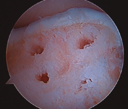 - Inicialmente procedemos a retirar el cartílago inestable, el hueso necrótico y la capa superior calcificada mediante un sinoviotomo, fresa motorizada, junto con instrumental de curetaje artroscópico (Figura 1).