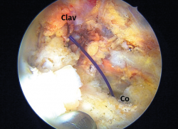 Figura 3. Realizamos la selección del punto en el cuello de la coracoides de forma percutánea bajo visión directa artroscópica. Hombro derecho con la óptica en un abordaje anterolateral. Clav: extremo distal de la clavícula; Co: cuello de la coracoides.