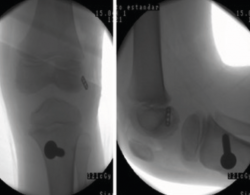 Figura 5. Radiografía de control intraoperatoria de un paciente de 6 años con reconstrucción según la técnica transepifisaria de Anderson.