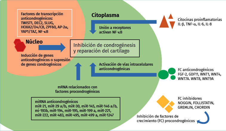 La supresión de los factores anticondrogénicos es una forma de estimular la condrogénesis in situ de las MSC articulares (reparación endógena) o de liberar MSC con alto potencial condrogénico (terapia celular)(10). Los factores “anticondrogénicos” incluyen mediadores proinflamatorios y factores inductores de la hipertrofia de los condrocitos maduros.