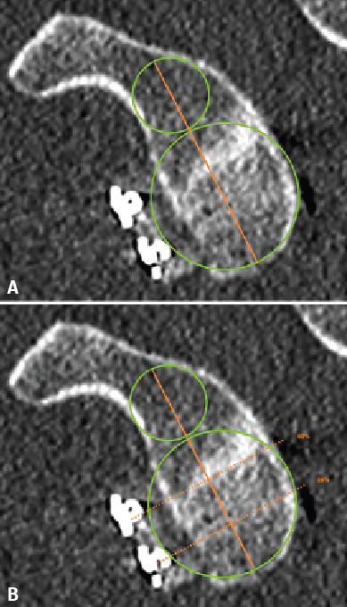 Tomando como referencia el reborde glenoideo posteroinferior, se trazó una primera circunferencia sobre su contorno y una segunda por encima de la anterior y tangencial a los rebordes glenoideos. La línea que unía el centro de ambas circunferencias se consideró el eje de la glena. Se estimó sobre este el punto correspondiente a la mitad y el 25% de la altura glenoidea (Figura 1). Para conocer la posición del injerto en sentido craneocaudal se empleó el corte sagital (Figura 2). Se midió en milímetros la longitud del defecto óseo (B) y la cantidad del injerto óseo que cubría dicho defecto (A). El porcentaje de cobertura del defecto óseo se estimó a partir del cociente entre A y B. Se consideró que el injerto se encontraba bien posicionado cuando el porcentaje de cobertura del defecto era de, al menos, un 90%.