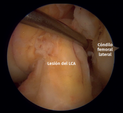 Figura 5. Rotura del ligamento cruzado anterior (LCA) de la rodilla izquierda vista desde el portal anterolateral. Sonda colocada en el portal anteromedial.