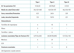 La Tabla 1 muestra el número de lesiones meniscales en cada tipo de fractura.