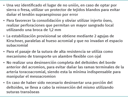 No existe consenso sobre cuál es la mejor opción para la fijación del os acromiale inestable sintomático de tipo mesoacromion. El tratamiento de preferencia de los autores para estos casos es la utilización de tornillos canulados reforzados con una banda de tensión de sutura de alta resistencia dispuesta en una configuración en “8” sin el agregado de injerto óseo, utilizando un abordaje transacromial, de medial a lateral, con mínima desinserción del deltoides del borde anterior del acromion.