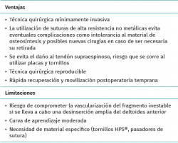 Gran variedad de técnicas se han descrito, sin existir consenso sobre cuál es la mejor opción para la fijación del os acromiale inestable sintomático de tipo mesoacromion.