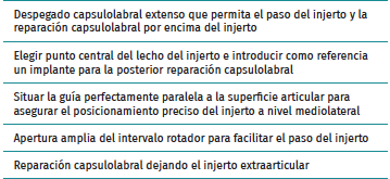 Se cambia la visión al portal anterosuperior y por el portal posterior se introduce la guía glenoidea, que es avanzada, de forma paralela a la superficie glenoidea, hasta posicionar el gancho de esta en el centro del defecto óseo. Se asegura la guía con 2 cánulas que se introducen, a través de 2 pequeñas incisiones accesorias, hasta contactar con la cortical posterior. A través de ellas se brocan ambas corticales con una broca de 2,8 mm que lleva asociada una vaina, de manera que al retirar la broca la vaina queda posicionada al nivel del brocado. Este paso se realiza en 2 ocasiones para la introducción de 2 vainas, una superior y otra inferior al gancho de la guía glenoidea, separadas entre ellas 10 mm. A través de estas vainas se introducen 2 asas de monofilamento que serán rescatadas secuencialmente por el portal anterior para el posterior paso del injerto. Se pueden ya retirar ambas vainas y la guía glenoidea, cuidando de no contactar el gancho de la guía con la superficie glenoidea para evitar daños condrales.