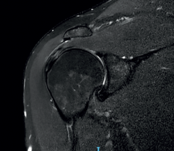 Figura 7. Rotura de espesor parcial bursal del supraespinoso en visión por resonancia magnética nuclear.