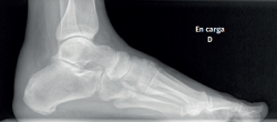 La radiografía simple en carga es la herramienta diagnóstica imprescindible de inicio(20). Permite valorar alineaciones, dismetrías, medir ángulos, determinar la morfología del calcáneo y su tuberosidad posterior, caracterizar exostosis óseas, aumentos de grosor en las partes blandas retrocalcáneas y planificar gestos quirúrgicos (Figura 3).