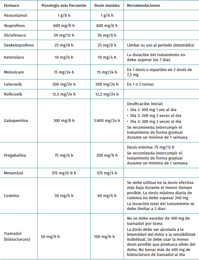 El paracetamol es uno de los analgésicos más utilizados en todo el mundo. Se sabe que la analgesia con paracetamol tiene un techo no muy alto, pero puede ser adecuada para el tratamiento del dolor leve a moderado. Se trata de un medicamento eficaz, seguro, barato y con un perfil de efectos adversos favorable(51). Sin embargo, su mecanismo de acción es poco conocido. Existe alguna evidencia de que tiene un efecto antinociceptivo central y también puede prevenir la producción de prostaglandinas a nivel celular. A diferencia de los AINE, no irrita la mucosa gástrica, no afecta la función plaquetaria ni provoca insuficiencia renal, por lo que se trata de un medicamento muy versátil(1). La dosis más utilizada es de 1 g cada 8 horas, si bien se puede alcanzar la dosis máxima de 1 g cada 6 horas, si se precisa (Tabla 1).
