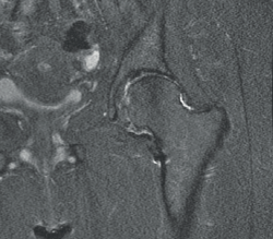 Figura 8. Corte coronal de resonancia magnética en secuencia T2 que evidencia disminución del cartílago articular y pinzamiento del espacio femoroacetabular.