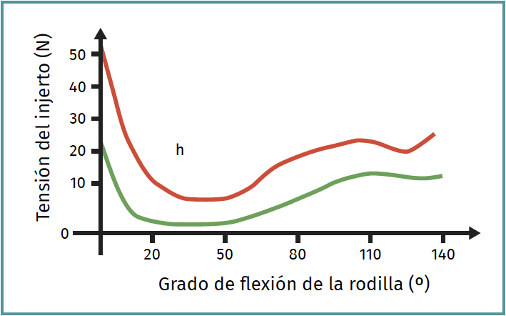 Figura 6. Variaciones medias de la tensión del injerto. La línea verde representa la variación de tensión que sufre un injerto durante el rango del movimiento de la rodilla en condiciones de “comportamiento isométrico”. La línea roja representa al patrón de tensiones que sufre un injerto con localización anterior del túnel femoral con valores significativamente elevados en el rango de 80-120 grados del rango de movimiento.