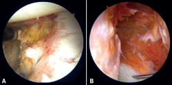 Figura 2. Corroboración de las lesiones. A: en la glena; B: en la cabeza humeral. Hombro derecho con portal de visión anterosuperior para esta y el resto de las figuras.