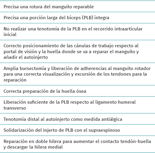 • Indicación principal: esta técnica quirúrgica está indicada como adyuvante a una reparación del manguito, con el objetivo de descargar mecánicamente la reparación a corto plazo y hacer una aumentación biológica a medio plazo, así como restringir el escape anterosuperior de la cabeza humeral a largo plazo; por lo tanto, requiere de roturas reparables del manguito.