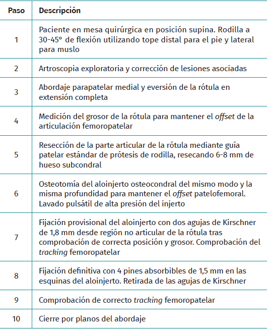 Tabla 1. Técnica quirúrgica paso a paso: trasplante osteocondral de la rótula mediante cilindro osteocondral
