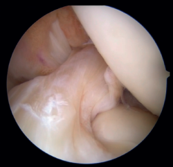 Figura 2. Imagen de rotura del ligamento cruzado anterior (LCA) de tipo 1 de Sherman con buena calidad del tejido. Rodilla derecha, visión desde el portal anterolateral.