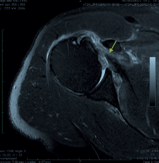 Figura 1. Imagen axial por resonancia magnética de una rotura subescapular aguda de espesor completo. Flecha: rotura del tendón subescapular.