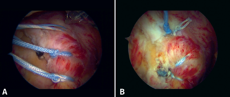 Figura 4. Vista artroscópica no convencional de la reparación híbrida del subescapular en hilera simple utilizando un anclaje con nudo en la porción superior con una puntada Mac y un anclaje sin nudo en la porción inferior con cintas de sutura de tipo luggage tag. A: antes de anudar y fijar con cinta; B: reparación final con anclaje inferior sin nudos.
