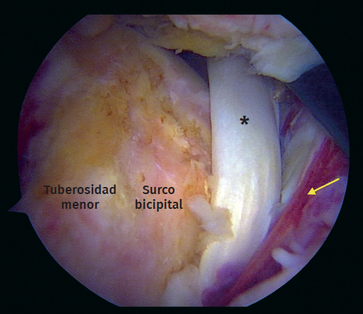 Figura 5. Vista artroscópica. Rotura completa del subescapular con inestabilidad medial de la cabeza larga del tendón del bíceps. Asterisco: tendón del bíceps. Flecha: rotura del tendón subescapular.