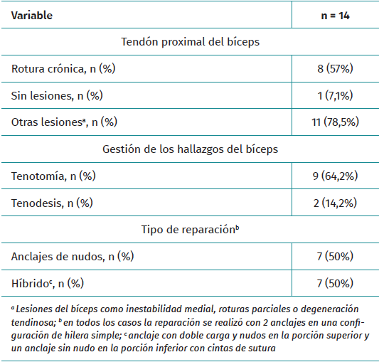 Durante el periodo descrito, se intervino a un total de 15 pacientes que cumplían con los criterios de inclusión. Se excluyó a un paciente debido a que el tiempo de seguimiento era insuficiente. Se incluyeron un total de 14 pacientes (Tabla 1), con una edad promedio de 65 años (rango de 46 a 76 años), 8 de los cuales eran hombres (57%). El tiempo promedio de seguimiento fue de 29,4 meses (rango de 24 a 41 meses). De los 14 pacientes evaluados, 13 (92,8%) presentaban algún compromiso del bíceps proximal como roturas parciales, lesiones degenerativas o inestabilidad medial (Figura 5). Se realizó una tenotomía del bíceps en 9 pacientes (64,2%), una tenodesis intraarticular en 2 casos (14,2%) y se detectó una rotura crónica del bíceps en 2 pacientes (14,2%). En la mitad de los pacientes (7) la rotura subescapular se reparó con 2 anclajes con nudo y en los restantes, con una fijación híbrida utilizando un anclaje superior con nudo y un anclaje inferior sin nudo con cintas de sutura (Tabla 2).