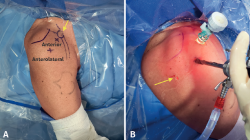 Figura 3. Marcado intraoperatorio. A: de los portales artroscópicos para la reparación artroscópica de lesiones del subescapular. B: lente artroscópica a través del portal anterolateral, cánula de 8 mm en el portal anterior. Flecha: portal accesorio para manejar las suturas.