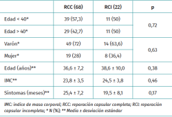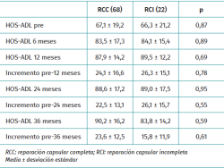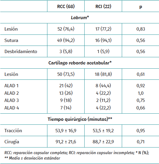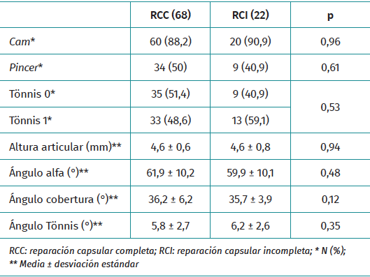 Resultados: se incluyeron en el estudio 90 pacientes, 68 con RCC y 22 con RCI. No se detectaron diferencias significativas en los datos generales y radiológicos entre ambos grupos. Los hallazgos intraoperatorios y las técnicas quirúrgicas artroscópicas realizadas fueron similares en ambos grupos. El seguimiento medio fue de 41,5 ± 7,2 meses en el grupo RCC y 38,4 ± 7,2 meses en el grupo RCI. La puntuación media en la escala Hip Outcome Score mejoró significativamente a los 3 años de seguimiento mínimo en ambos grupos. Los valores e incrementos medios al año, 2 años y 3 años; y el porcentaje de pacientes que alcanzaron la significación clínica al año y 2 años fue similar en ambos grupos.
