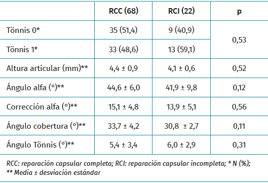 Los pacientes se distribuyeron en 2 grupos según el manejo capsular en la artroscopia de cadera. En el grupo caso se incluyeron los pacientes en los que se había realizado la reparación capsular completa (RCC): rama vertical y capsulotomía interportal. En el grupo control se incluyeron los pacientes en los que se realizó una reparación capsular incompleta (RCI): rama vertical sin reparación de la capsulotomía interportal.