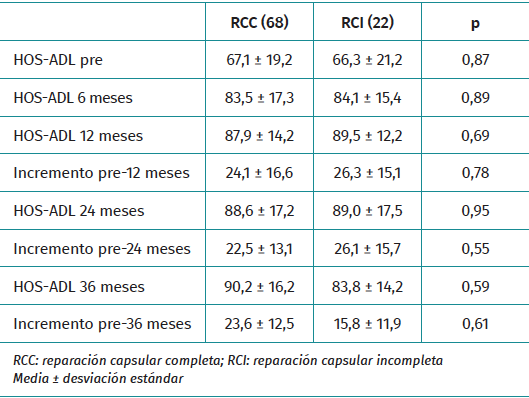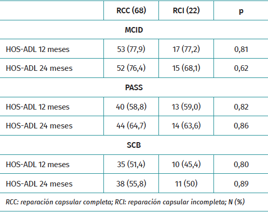 Si analizamos los estudios que comparan exclusivamente si se ha reparado o no la capsulotomía interportal, los resultados son contradictorios. Bonin et al. no refieren diferencias en los cuestionarios de valoración clínica iHOT-12, mHHS y HAGOS a 2 años de seguimiento, en su estudio comparativo entre 49 pacientes con cierre capsular interportal y 51 pacientes sin cierre capsular interportal en el tratamiento del CFA de tipo cam o mixto mediante CAC(17). Atzmon et al. no encuentran diferencias significativas a 2 años de seguimiento entre pacientes intervenidos mediante CAC por CFA a los que se realizó reparación de la capsulotomía interportal (n = 5), con los que no se realizó la reparación de la capsulotomía interportal (n = 29), en los cuestionarios mHHS y HOS, ni en el grado de satisfacción(18). Bindi et al. no encontraron diferencias significativas en los cuestionarios de valoración mHHS, Single Assessment Numeric Evaluation (SANE), EAV y Veterans RAND12 a 2 años entre los pacientes tratados mediante CAC por rotura labral con reparación capsular interportal (n = 240) y reparación capsular en T (n = 48)(19). Con un seguimiento de 5 años, Filan et al. compararon los resultados clínicos mediante mHHS, UCLA y SF-36 en 570 pacientes tratados mediante CAC de CFA distribuidos en 285 con cierre capsular interportal y 285 sin cierre capsular interportal. La puntuación en el cuestionario SF-36 fue mayor en el grupo de reparación capsular, pero similar en mHHS y UCLA. Una significativa mayor proporción de pacientes alcanzaron el MCID para UCLA y el SCB para SF-36, sin diferencias para el resto de los cuestionarios utilizados(20). Beck et al. publicaron un estudio comparativo de 75 pacientes intervenidos mediante CAC por CFA en los cuales se realizo una capsulotomía en T. En 25 se reparó solamente la rama longitudinal y en 75 se reparó la rama longitudinal y la capsulotomía interportal. A 5 años de seguimiento refieren superiores resultados significativos en el grupo de reparación completa en el HOS-AVD, HOS-SSS, mHHS y EAV. El porcentaje de pacientes que alcanzaron el MCID y el PASS en al menos un cuestionario de valoración también fue significativamente mayor en el grupo de reparación capsular completa(21). Bolia et al. también publican mejores resultados clínicos en los cuestionarios HOS-AVD y mHHS a 5 años en 42 pacientes con reparación de la capsulotomía interportal comparados con 84 pacientes sin reparación de la capsulotomía interportal. El porcentaje de pacientes que alcanzó el MCID fue significativamente mayor para el HOS-AVD, pero no para el mHHS(22). En nuestro estudio con seguimiento mínimo de 3 años no encontramos diferencias significativas en el resultado clínico a 3 años, ni en la significación clínica a 1 y 2 años para el HOS-AVD entre RCC y RCI, al igual que refieren estudios con seguimiento similar(17,18,19).