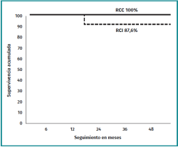 La puntuación media en la escala de valoración mejoró significativamente a los 3 años de seguimiento mínimo. Los valores e incrementos medios fueron similares entre ambos grupos (Tabla 5). El porcentaje de pacientes que alcanzaron la significación clínica al año y 2 años fue similar en ambos grupos (Tabla 6). Durante el periodo de seguimiento, un paciente del grupo de RCI precisó reintervención quirúrgica mediante CAC a los 21 meses de seguimiento por insuficiente osteoplastia femoral. La supervivencia a los 36 meses de seguimiento fue del 100% en el grupo de RCC y del 87,6% en el grupo de RCI (p = 0,03) (Figura 1).