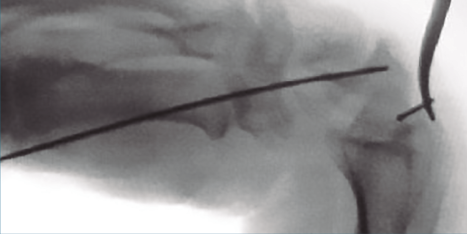 Figura 10. Imagen de comprobación de reducción y compresión de la fractura desde portales mediocarpianos.