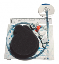 Se realizará un orificio de unos 2 cm aproximadamente en la lámina adhesiva sobre el cual se coloca el tubo fenestrado que consta de doble luz: una que hace función de drenaje y que se conecta a su vez a un dispositivo de succión que recoge todo el exudado en un depósito de productos de desecho y la otra luz que nos permite realizar la instilación de la solución (Figuras 7 y 8).