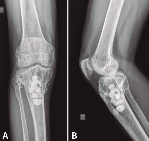 Figura 7. Radiografías de frente y de perfil del extremo proximal de la tibia tras el desbridamiento de la cavidad y el relleno con bolas de cemento con antibiótico.