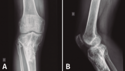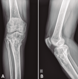 Figura 5. Radiografías de frente y de perfil del extremo proximal de la tibia donde se objetiva la cavidad en la tibia con presencia de material granulado en su interior.