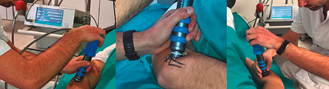 Figura 3. Aplicación de ondas de choque extracorpóreas terapéuticas de tipo radial (rESWT) en epicondilopatía lateral y sus trigger points relacionados.