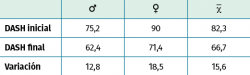 Como resultados se obtuvieron mejorías en la puntuación de la EVA y del DASH tal y como se detalla en las Figuras 4 y 5.