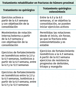 Es importante evitar las presiones negativas sobre la diáfisis humeral mientras no exista consolidación (palanca larga del brazo, trabajo de rotaciones metódicas, trabajo en cadena cinética cerrada contra resistencia), para evitar desplazamientos de la fractura. Los ejercicios resistidos de tonificación y fortalecimiento progresivo se deben indicar solo cuando se objetive radiológicamente la consolidación de la fractura, entre 6 y 12 semanas.