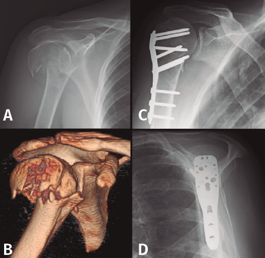 Figura 3. Evolución radiológica de una osteosíntesis con placa de una fractura de húmero proximal derecho. A: radiología simple anteroposterior preoperatoria; B: tomografía computarizada preoperatoria; C y D: evolución radiológica del tratamiento.