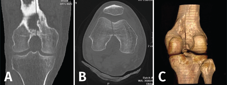Figura 18. A: corte de reconstrucción coronal; B: axial; y C: reconstrucción 3D de tomografía axial computarizada de rodilla: fractura longitudinal del fémur extendida al techo intercondilar.
