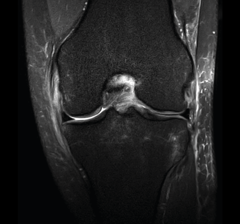 Figura 37. Corte de secuencia coronal T2 Fat-Sat de rodilla: pequeño edema en el LLI, banda medial por esguince del LLI de grado I.
