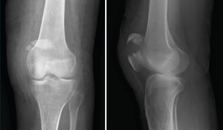 Deben hacerse proyecciones anteroposterior (AP) y lateral, generalmente con flexión de 30°, y axial de la rótula cuando se sospeche patología de esta; y proyecciones especiales oblicuas o laterales, proyecciones forzadas de varo o valgo, y AP en 45°, para valorar mejor la interlínea articular(2).