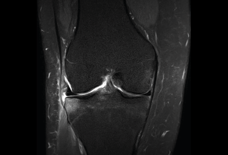 Figura 32. Corte de secuencia coronal T2 Fat-Sat de resonancia magnética de rodilla: rotura de menisco interno horizontal.