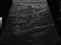 Figura 16. Corte transversal de una ecografía de pierna: colección hipoecoica intramuscular por hematoma que traduce rotura.