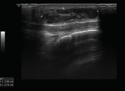 Figura 17. Corte transversal de una ecografía de pierna: colección hipoecoica prepatelar por bursitis muy heterogénea.