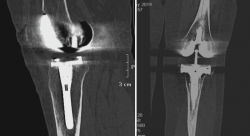 Figura 27. Corte de reconstrucción sagital y coronal de tomografía axial computarizada de rodilla: se valoran los componentes femoral y tibial de la prótesis total.