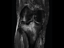 Figura 54. Corte de secuencia T1 y T2 Fat-Sat coronal de resonancia magnética: gran osteocondritis en el cóndilo femoral interno con edema en la medular adyacente.